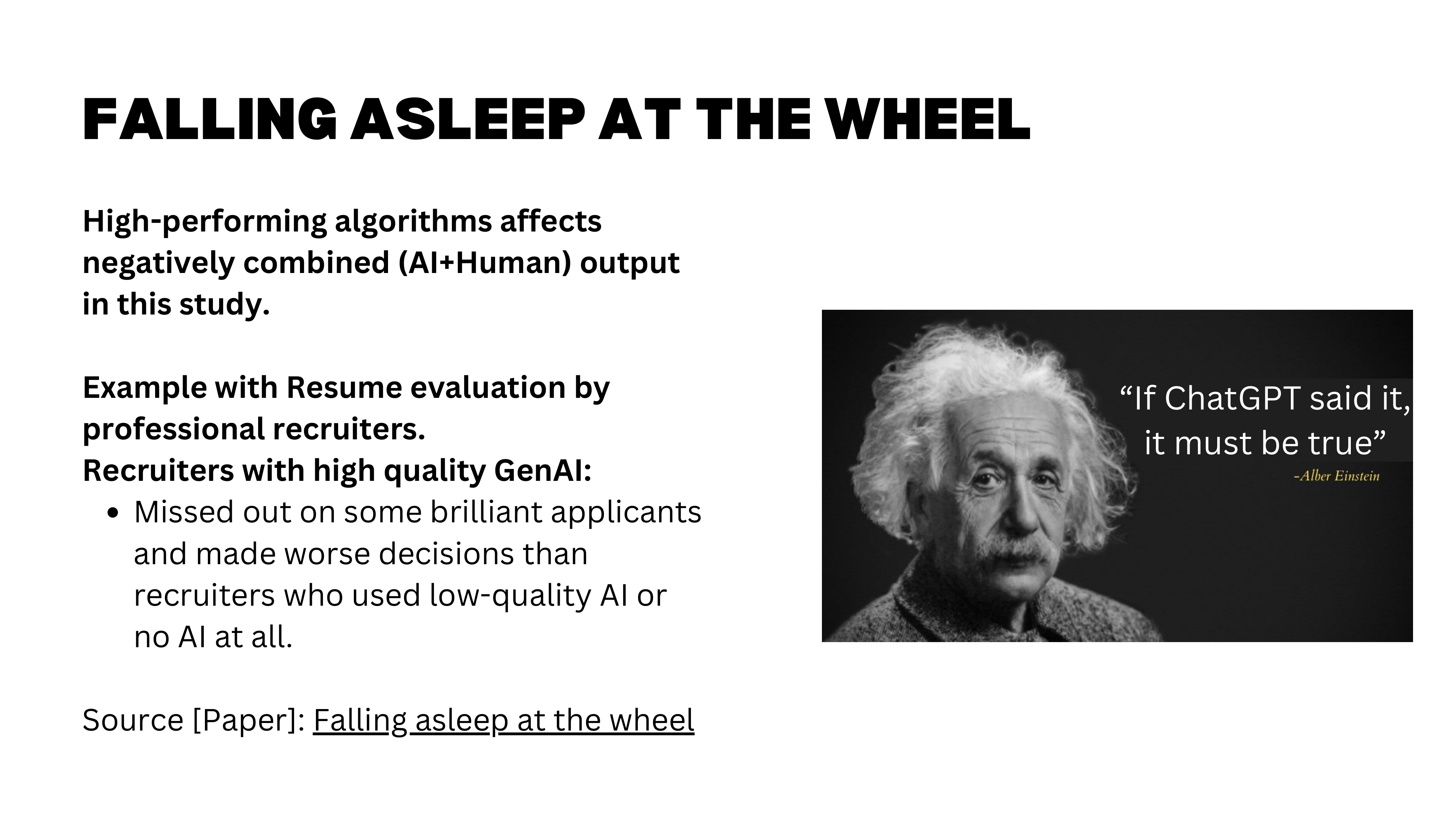 Research shows that over-reliance on AI degrades human performance over time. As models improve and users gain confidence in AI outputs, they invest less effort in verification. The combined quality of human-plus-AI work can actually decrease as people defer more to the machine. You “fall asleep at the wheel.”
