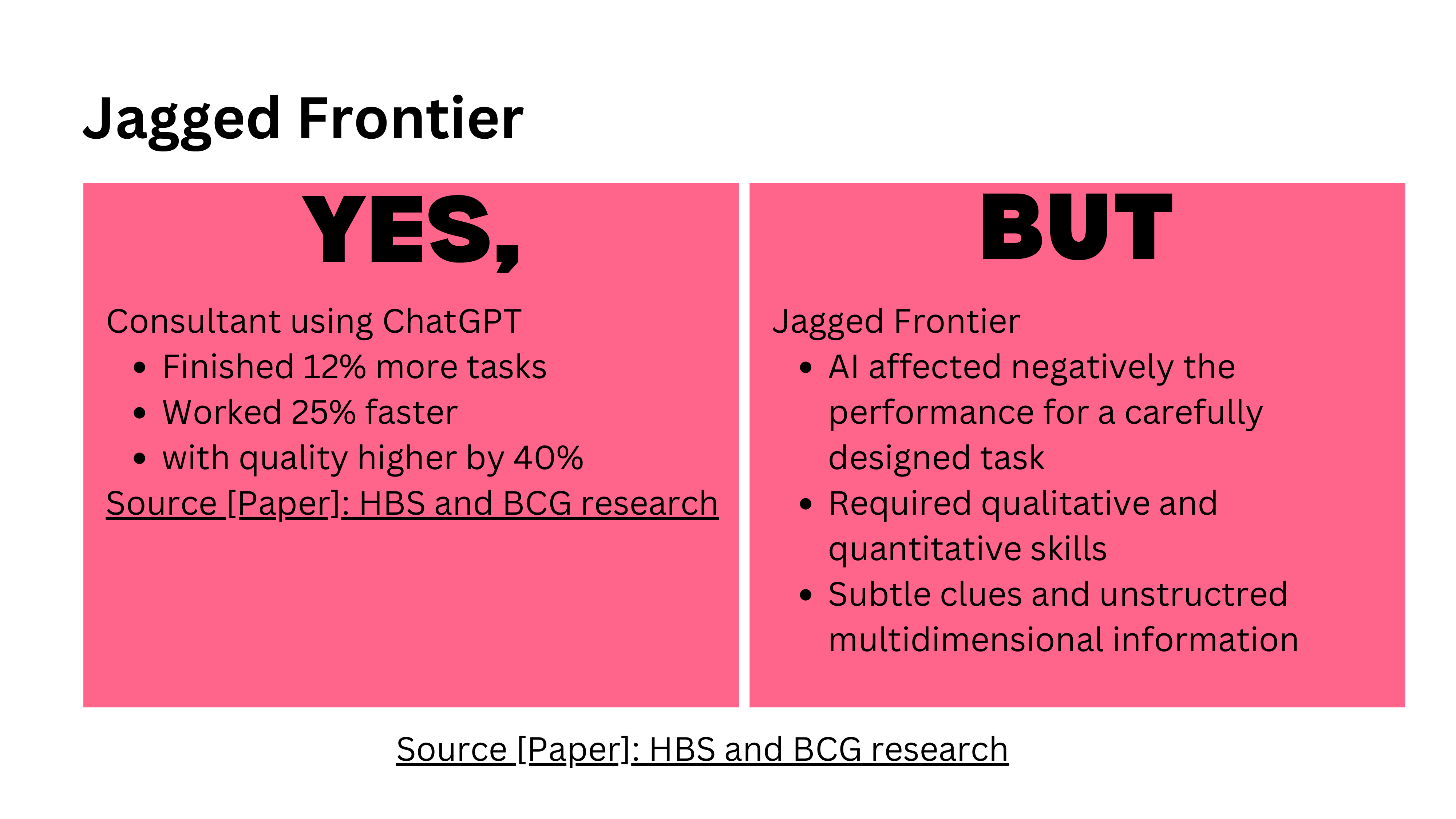 The “Jagged Technological Frontier” paper gets its name from this exact phenomenon: AI performance is uneven across tasks. In the Boston Consulting Group experiment, AI-assisted consultants performed worse on some tasks compared to those working without AI. The frontier is jagged — sometimes AI helps enormously, sometimes it hurts, and it is hard to predict which tasks fall on which side.
