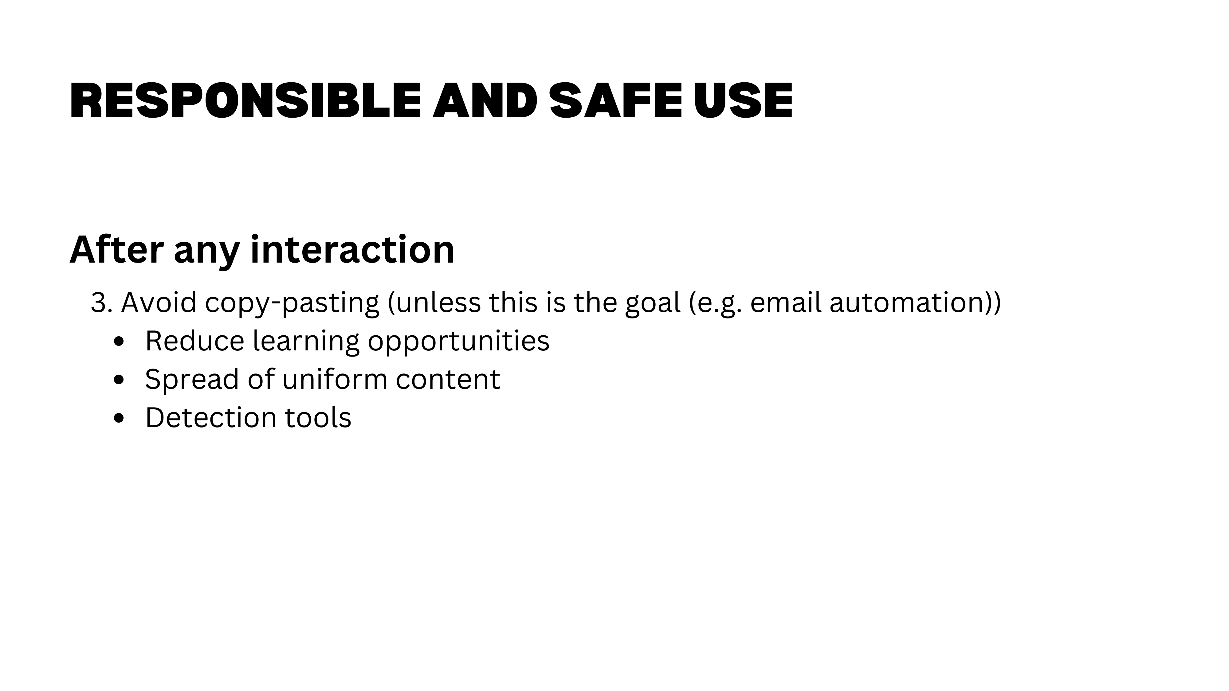 Rule 3: Never copy-paste directly. For all the reasons discussed — detection risk, learning loss, uniformity of output, and the signal it sends about how much you value the interaction.