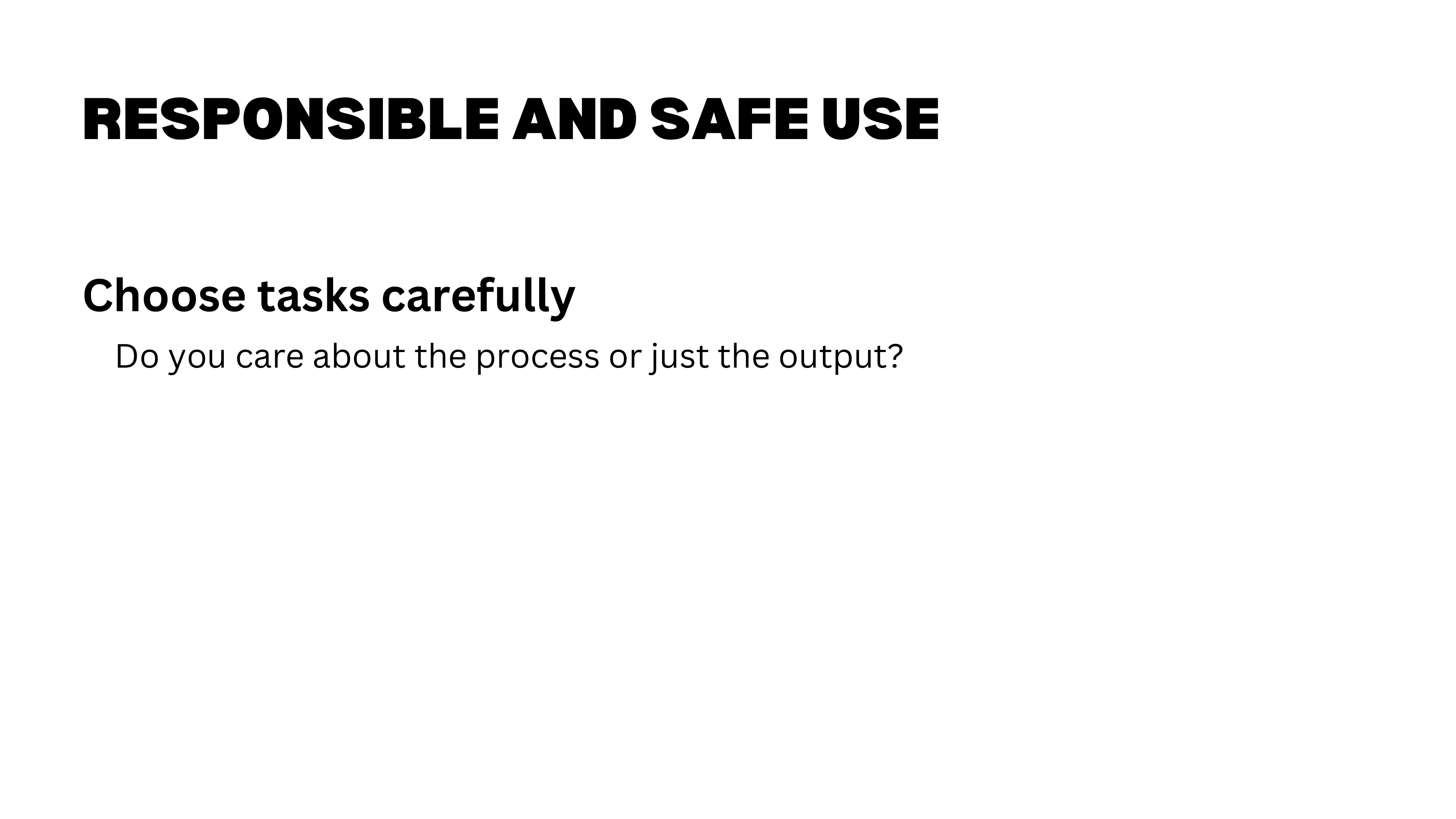 - The most important GenAI skill is judgment — weigh costs against benefits, choose your tasks carefully, never copy-paste directly, and always ask: “Am I here for the process or the output?”