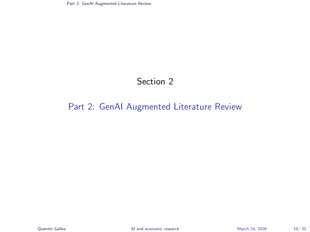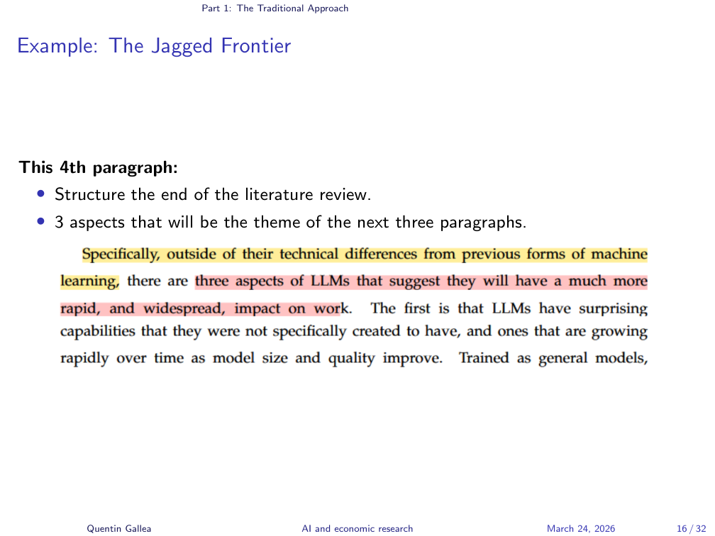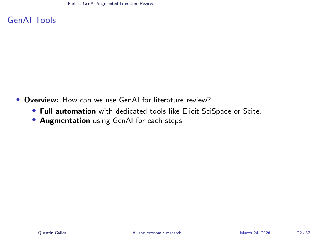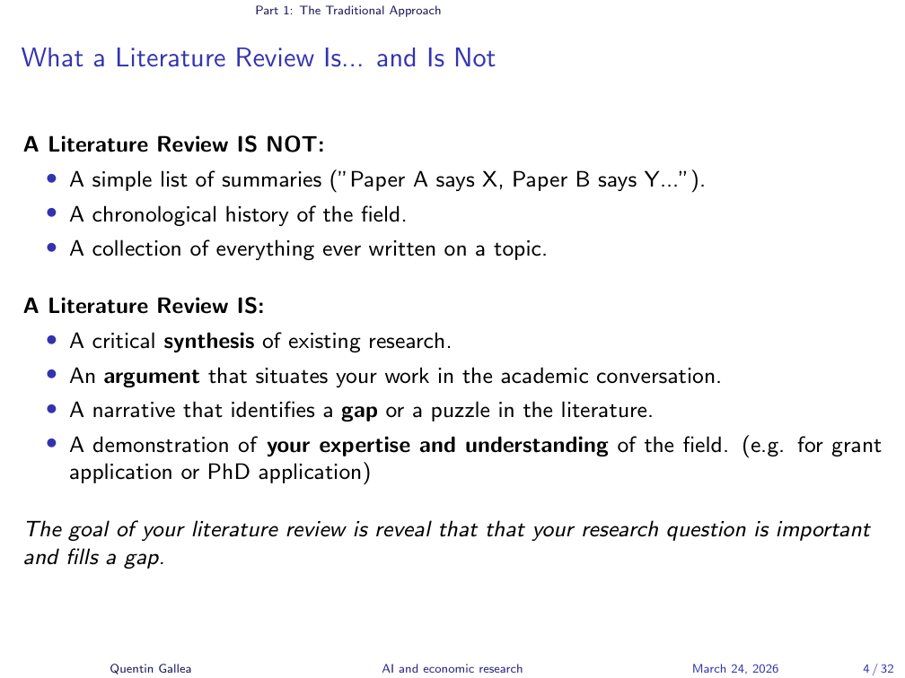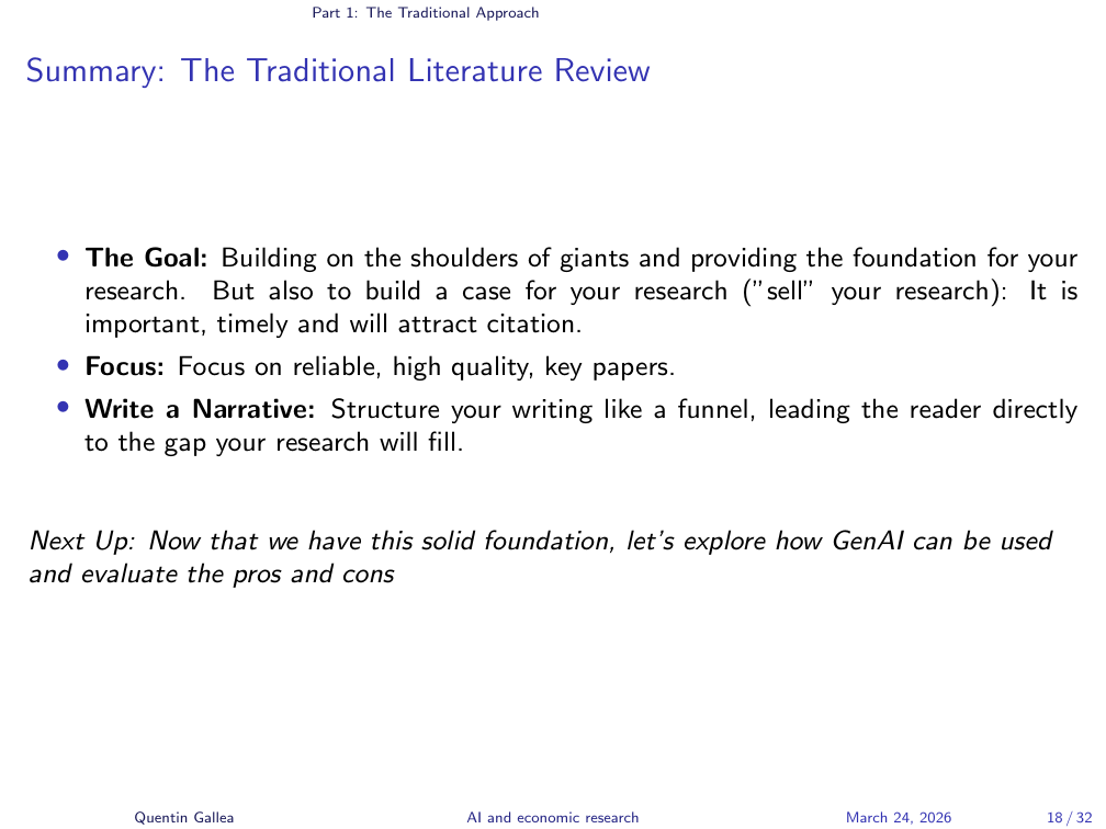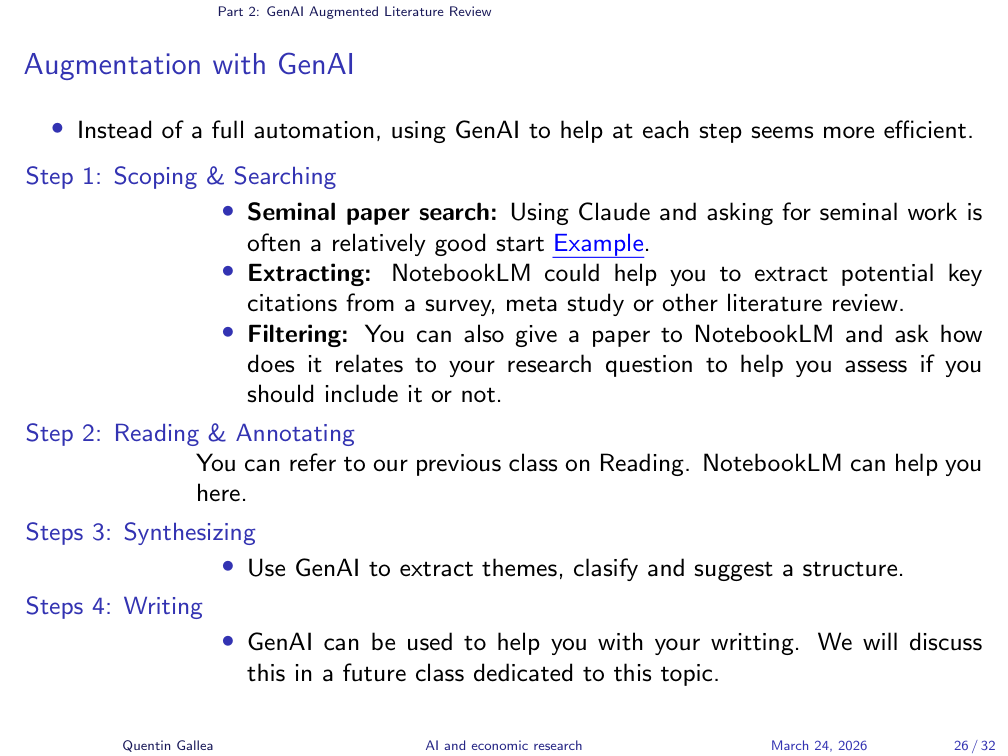 This session covers the art of the academic literature review — first through traditional methods (scoping, reading, synthesis, and narrative writing), then through GenAI augmentation (using tools like Elicit, Consensus, and NotebookLM). A detailed walkthrough of the “Jagged Technological Frontier” paper illustrates what an excellent literature review looks like. The session closes with a critical assessment of AI’s role and an in-class exercise.