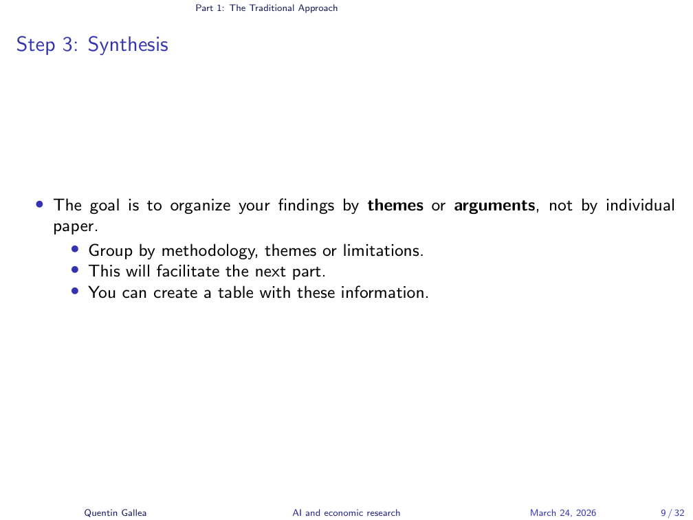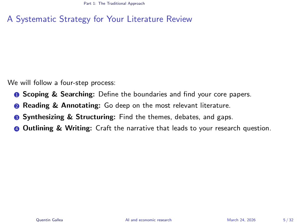 A standard approach to literature review follows four steps: (1) define the scope, (2) read and annotate papers (covered in the previous session), (3) synthesize — organize and structure your findings, and (4) write the narrative. The synthesis step is where a literature review transforms from something boring into something insightful. It requires real planning: how will you articulate and group the papers you’ve collected?