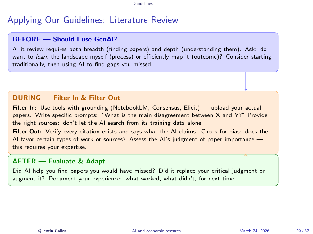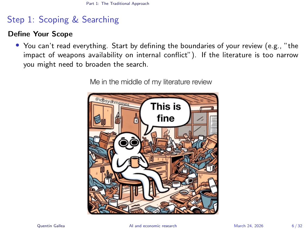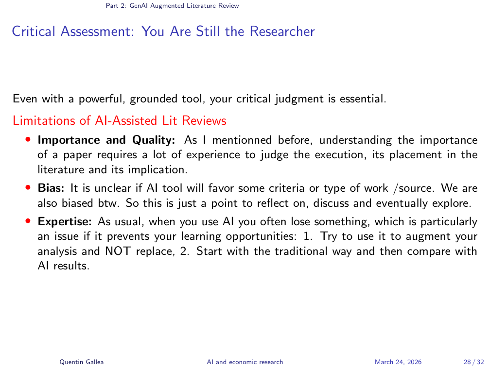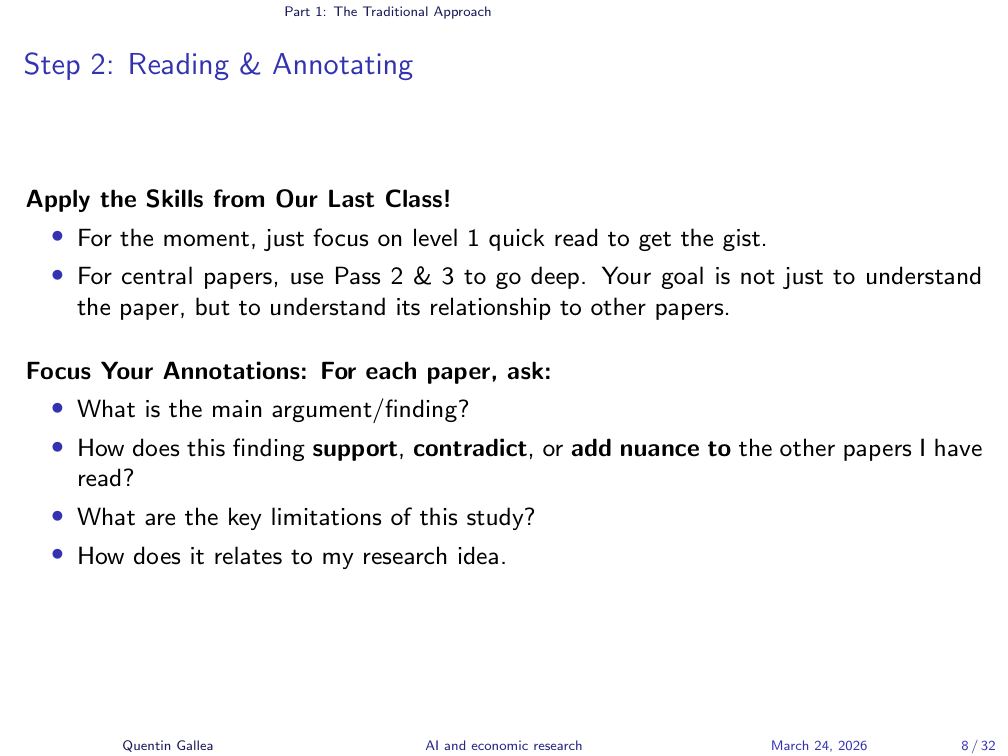 This connects to the outcome vs. process framework from earlier sessions. When you just need to know a paper’s research question or dataset — tasks where only the outcome matters — AI can extract that quickly. But when the process matters — understanding an argument, evaluating a method — you need to do the reading yourself. AI helps you reallocate time toward what requires your skills.