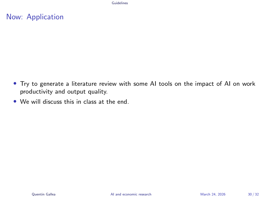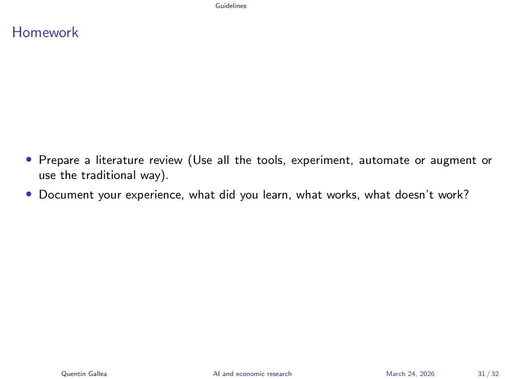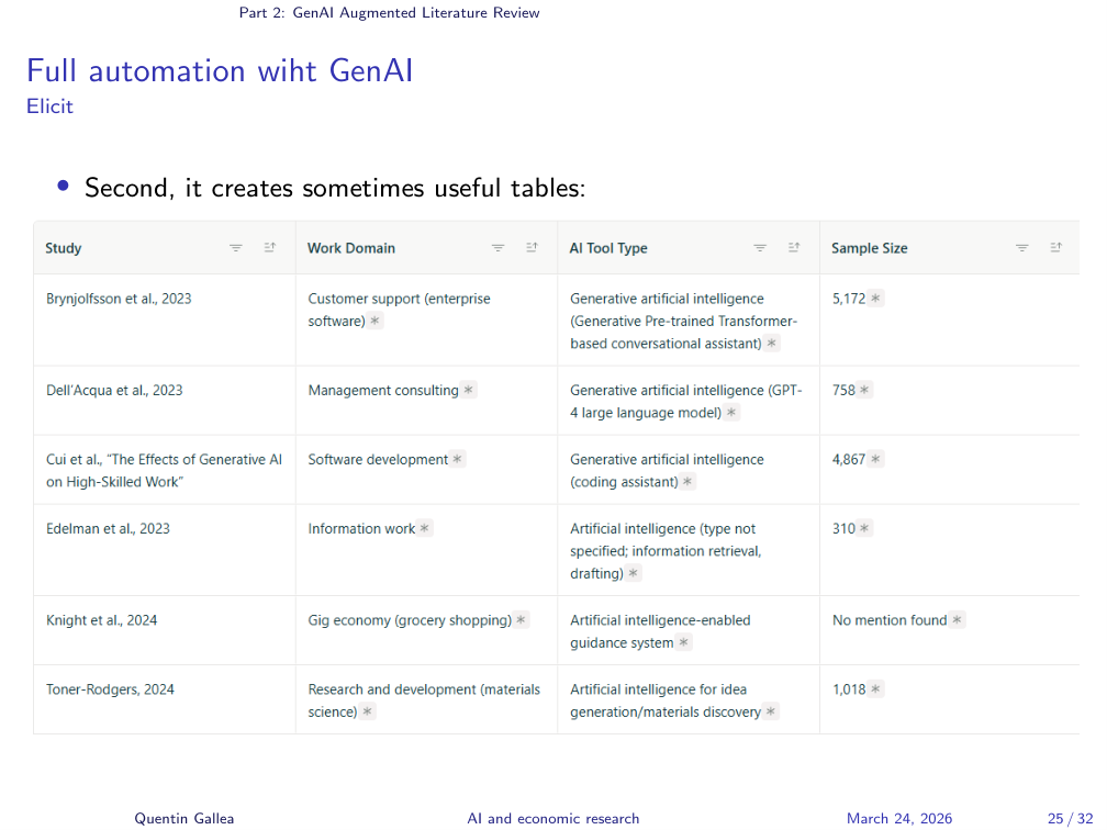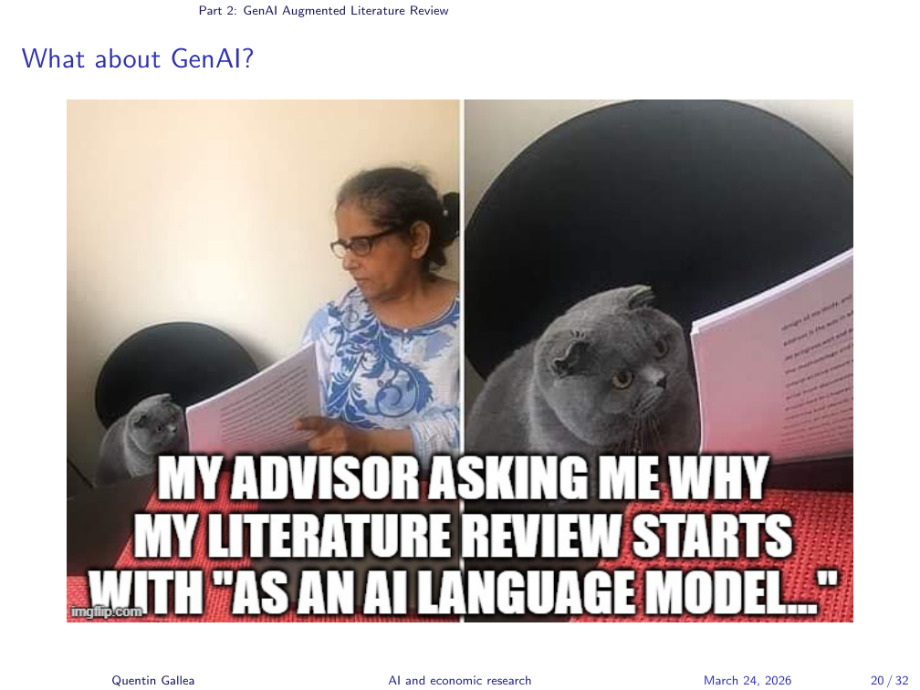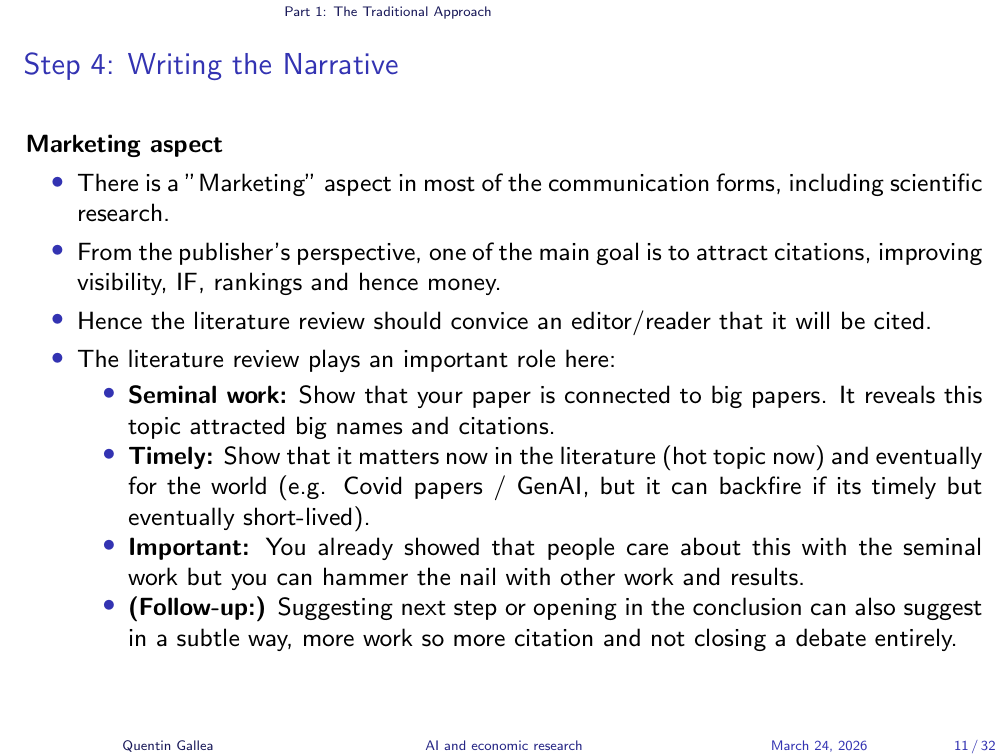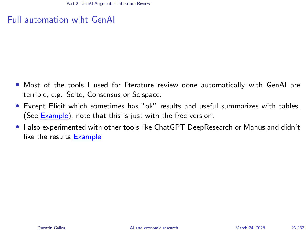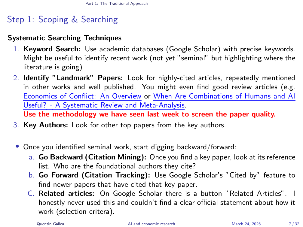 Finding seminal work: Ask Claude (or another LLM) for seminal work in a field. In Quentin’s experience, LLMs do this well — they identify highly cited, well-known papers rather than obscure, low-quality ones. They pick up the “big signal.” This is a good starting point, though you always verify quality.