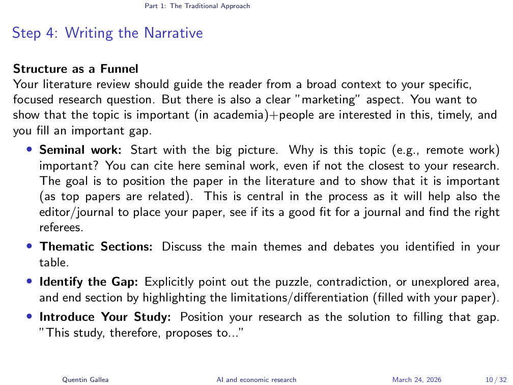 The answer depends on the literature available. For example, if you’re studying LLMs’ effect on work, you don’t have decades of research to draw on — the shock effectively started in 2023. You might have two or three reliable, relevant studies. In that case, you’d broaden your review: cover the historical findings on automation and work, then narrow to the recent LLM-specific evidence, and position your contribution as extending this emerging line of research.