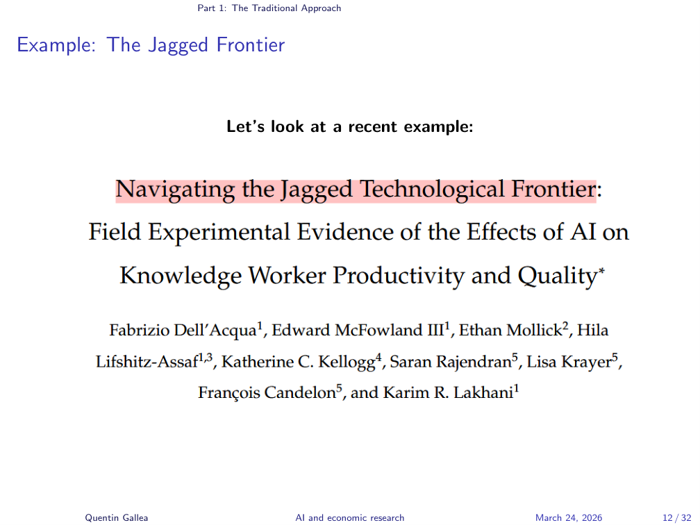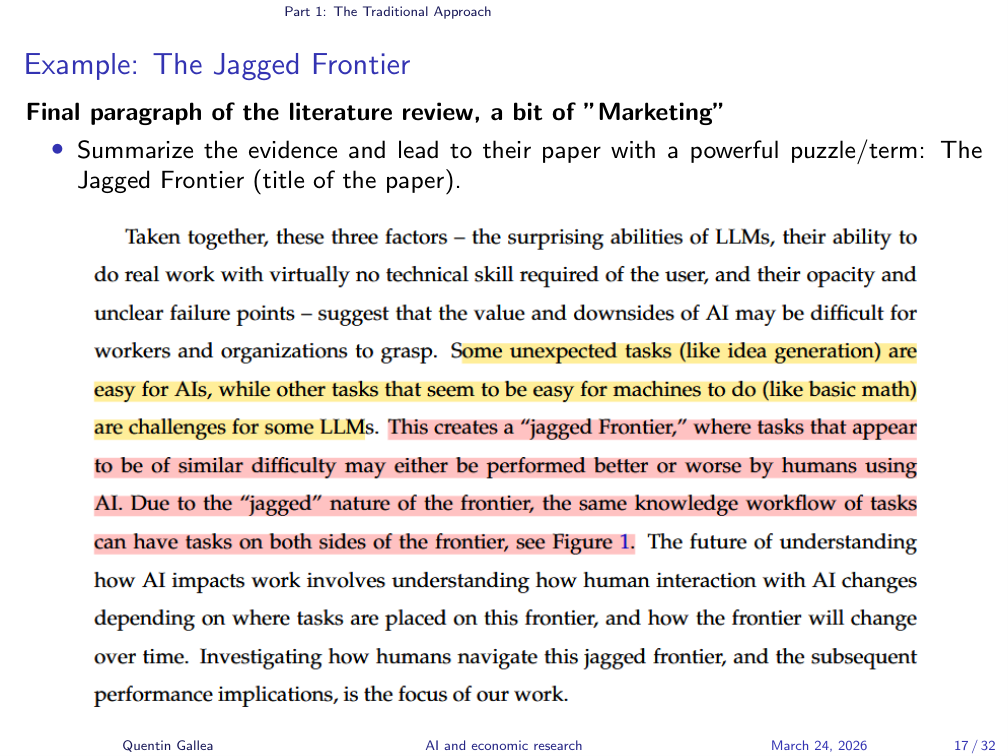 Finally, they introduce their key concept: the jagged technological frontier. The idea is that tasks very similar from a human perspective can fall on opposite sides of AI’s capability boundary — some are within AI’s frontier, some are beyond it. They coined a catchy term, paired it with a compelling visual in the paper, and created something memorable.