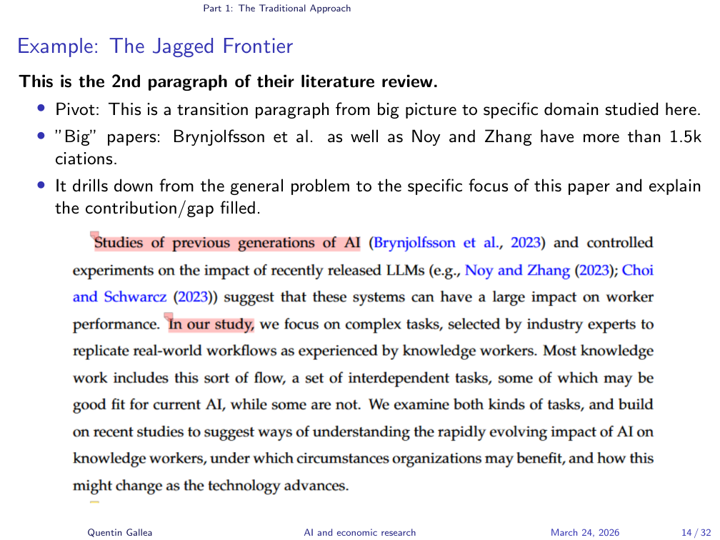 Let’s look at a concrete example of an excellent literature review: the “Navigating the Jagged Technological Frontier” paper by Lakhani and colleagues (recently published). These are top scholars, and their literature review is exceptionally well crafted.
