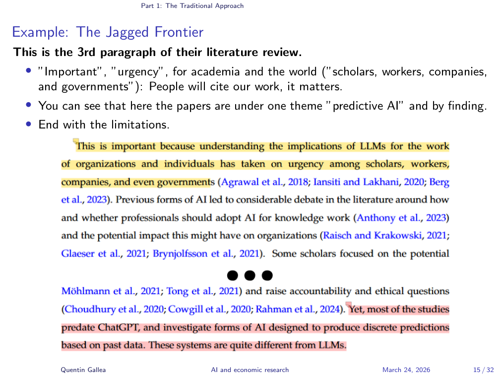 This single sentence does two things brilliantly. First, name dropping: it cites the most prominent scholars in the field (Acemoglu, Katz, and others), establishing that this is a topic studied by serious researchers. Second, it plants the seed of a gap: by saying “LLMs are new,” it implies that prior work hasn’t addressed LLMs specifically.