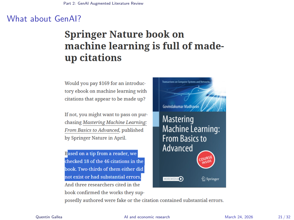 This isn’t hypothetical. The Springer Nature book on machine learning mentioned in an earlier session contained numerous fabricated or erroneous citations — 18 out of 46 citations didn’t exist or had significant errors. And it was published.
