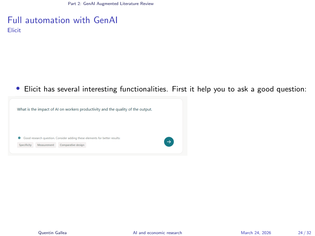 One useful feature in Elicit: when you enter a research question, it tells you if it’s too broad and suggests refinements. For example, it might ask: are you interested in generative AI specifically or AI more broadly? Are you measuring productivity at the worker level or the aggregate level? This question refinement step has real value.
