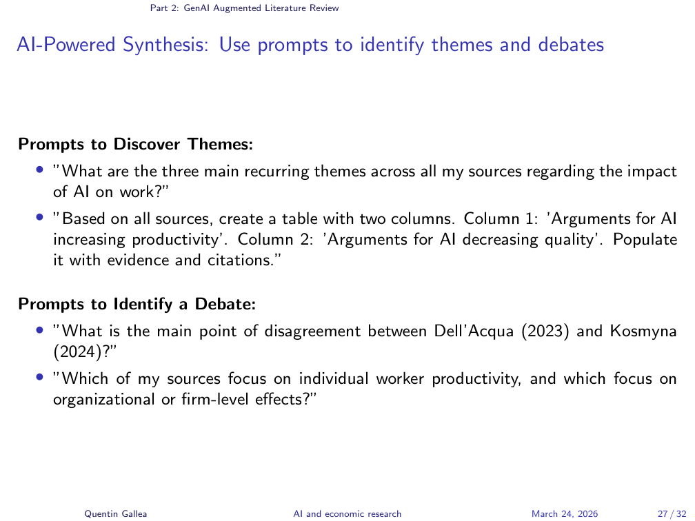 The slides include example prompts for using AI to identify themes, debates, and structural patterns in your collected literature. These are self-explanatory — adapt them to your own research question and paper collection.